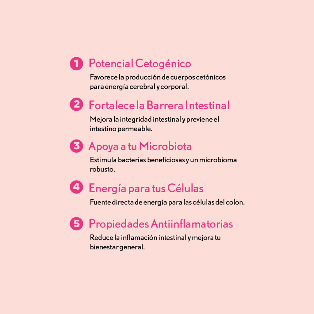 El primer Suplemento Dietario que enriquece tu dieta con ácido butírico sin aumentar el sodio. Utilizamos sal cálcica de ácido butírico, evitando el butirato de sodio común.