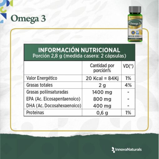 InnovaNaturals Omega 3 es un suplemento desarrollado con Aceite de Pescado de alta concentración de EPA y DHA, llegando a 600 mg de ácidos grasos EPA y DHA por cada cápsula de 1 gr.