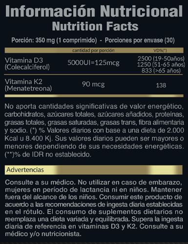 La Fórmula Combinada de vitamina K2 y D3 en un solo comprimido proporciona un soporte integral para quienes tienen deficiencia de estas vitaminas, ayudando a la absorción de calcio de los alimentos y su correcta distribución en el cuerpo