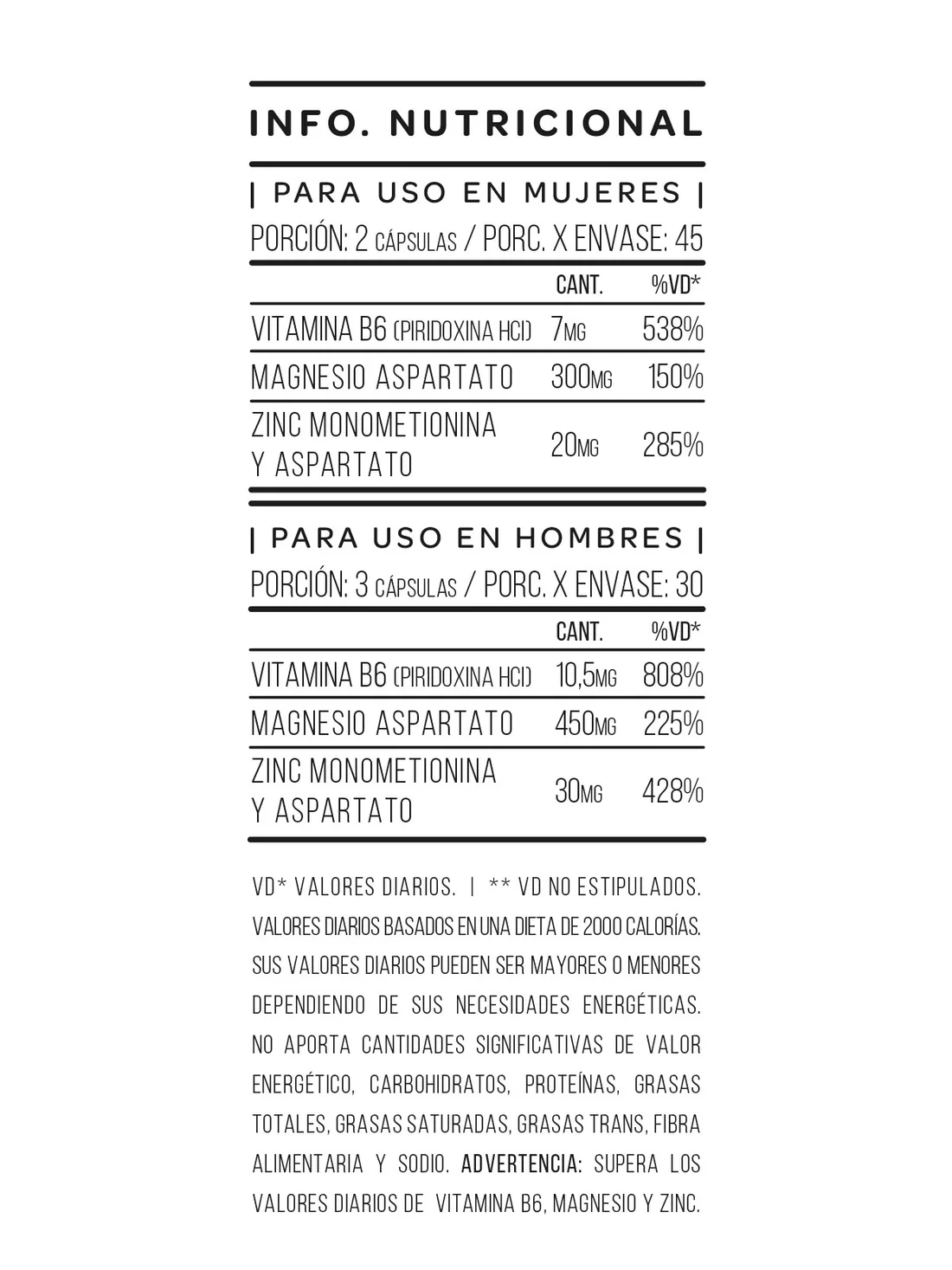 Magnesio Aspartato, Zinc Monometionina Aspartato, Vitamina B6 (Piridoxina HCI), Dióxido de Silicio, Magnesio Estearato.